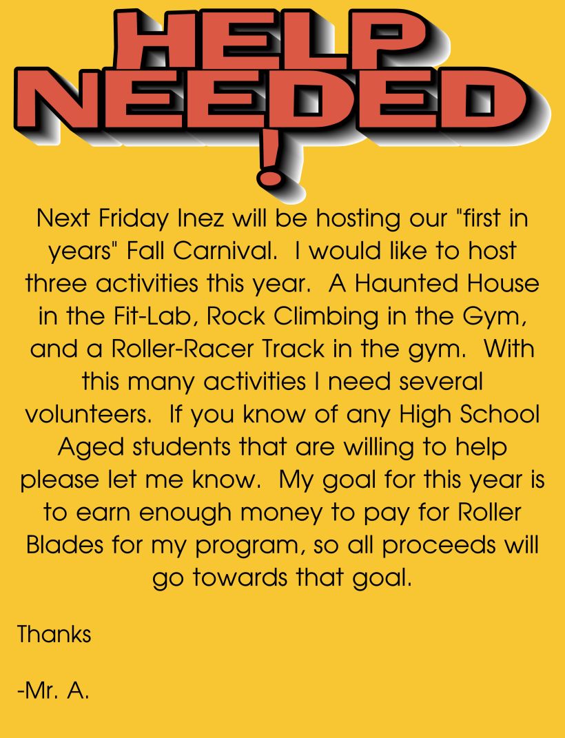 Uncategorized Fall Carnival!! October 19, 2018 Share this: Click to share on X (Opens in new window) X Click to share on Facebook (Opens in new window) Facebook Like Loading... Related Post navigation ← Name the Skeleton Contest!! A Little Late, but here we go again!! → About inezpe View all posts by inezpe → One thought on “Fall Carnival!!” Hi Coach, Can you email me what times you need volunteers on Friday ? I am sure that Asa and Rylan would love to help out, depending on their band activities . Reply ↓ Leave a comment Cancel replyBasic HTML allowed. Δ