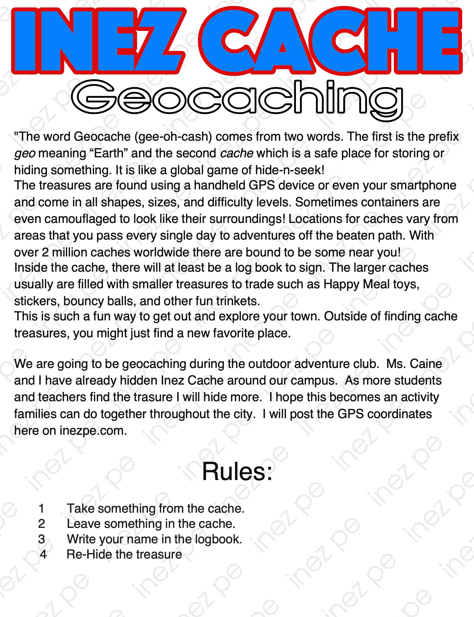 Uncategorized **Inez Cache** September 3, 2019 Share this: Click to share on X (Opens in new window) X Click to share on Facebook (Opens in new window) Facebook Like Loading... Related Post navigation ← T.W.I.P.E. Kids explain Geocaching → About inezpe View all posts by inezpe → Leave a comment Cancel replyBasic HTML allowed. Δ