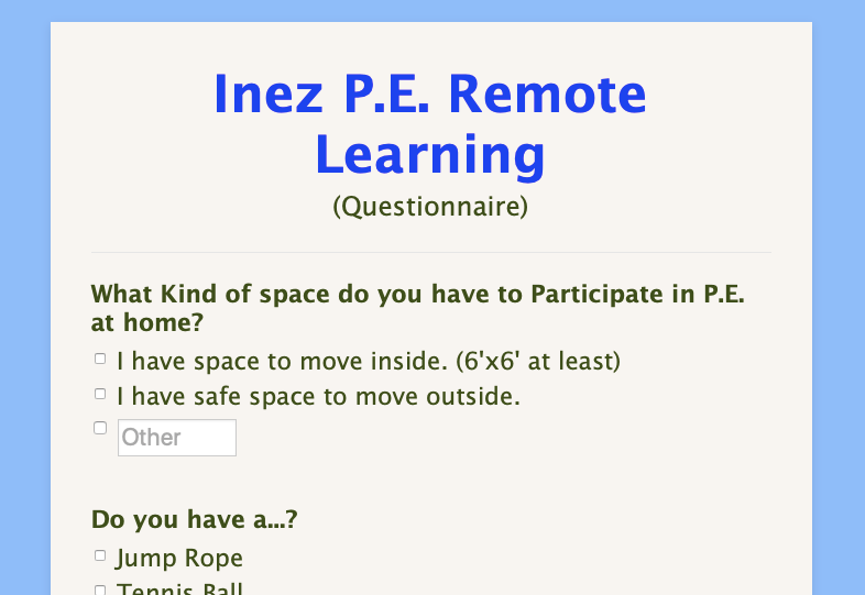 Uncategorized Inez families PLEASE complete this survey. July 26, 2020 Click The Pic!! Share this: Share on X (Opens in new window) X Share on Facebook (Opens in new window) Facebook Like Loading... Related Post navigation ← This… We can do this!! → About inezpe View all posts by inezpe → Leave a comment Cancel replyBasic HTML allowed. Δ