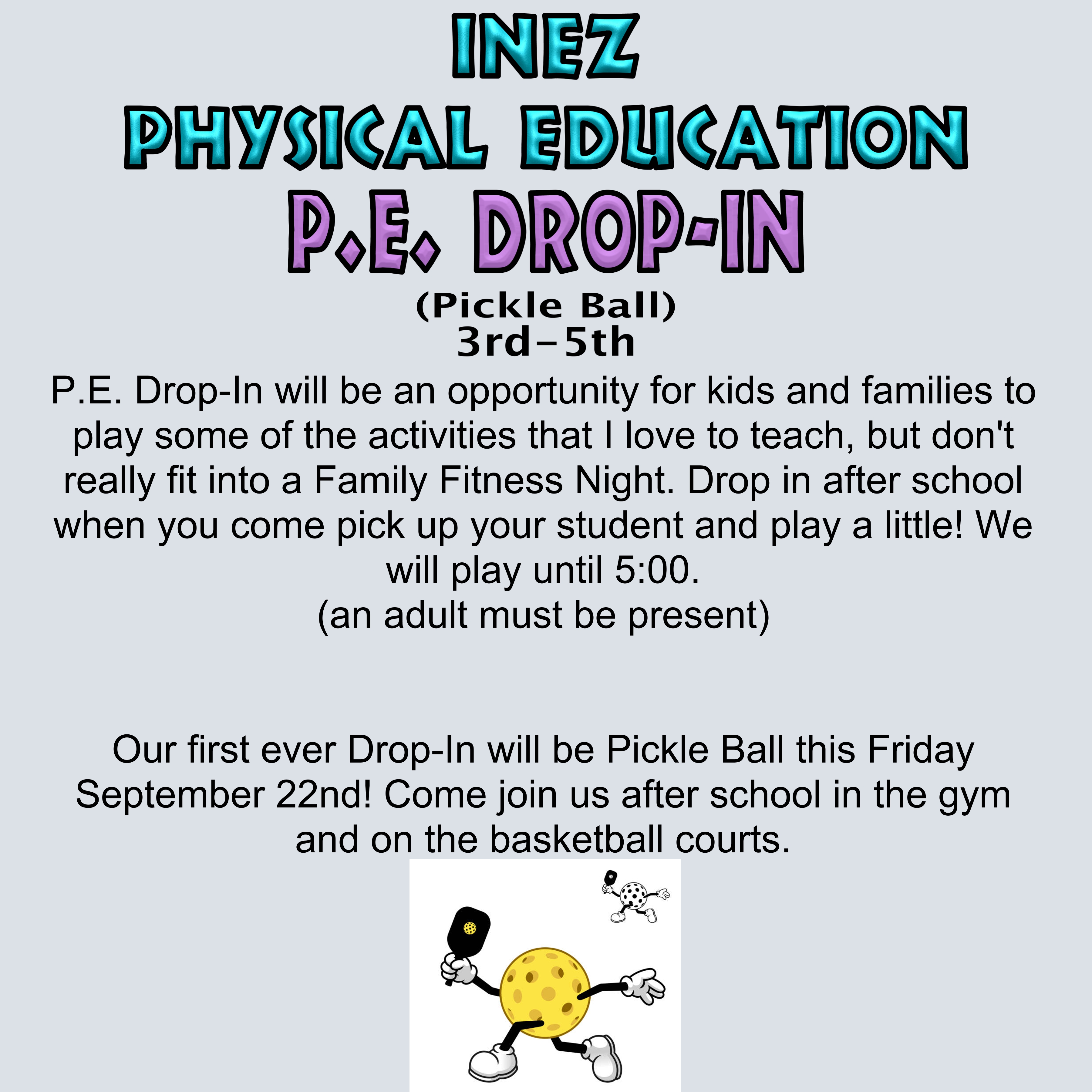 Events Uncategorized Inez P.E. Drop-In!! September 18, 2023 Share this: Click to share on X (Opens in new window) X Click to share on Facebook (Opens in new window) Facebook Like Loading... Related Post navigation ← Screen time and kids brains. We Know This!! → About inezpe View all posts by inezpe → Leave a comment Cancel replyBasic HTML allowed. Δ