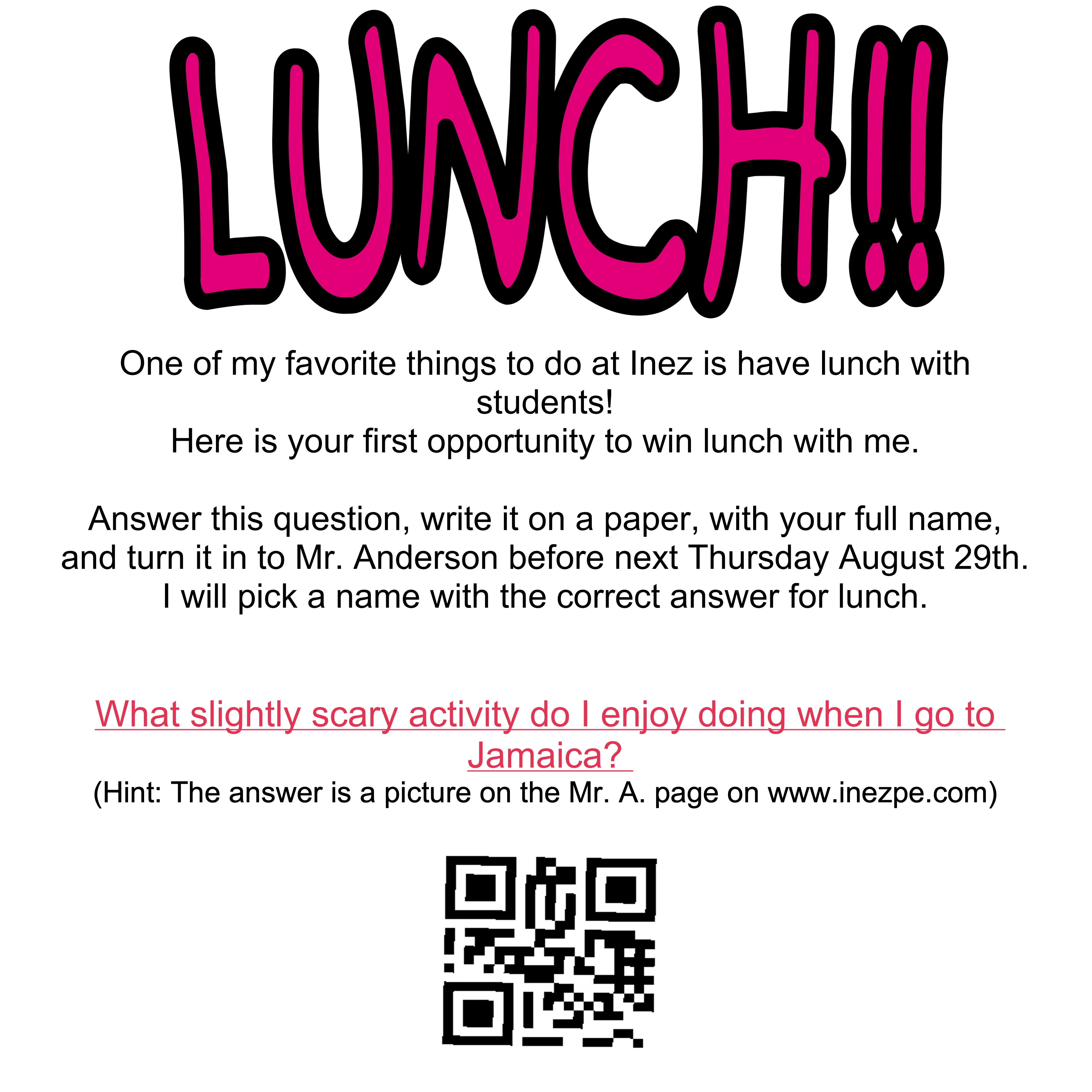 Uncategorized Lunch!! August 22, 2024 Share this: Click to share on X (Opens in new window) X Click to share on Facebook (Opens in new window) Facebook Like Loading... Related Post navigation ← Family Fitness Night (Cooperative Games) Fitnessgram Testing → About inezpe View all posts by inezpe → Leave a comment Cancel replyBasic HTML allowed. Δ