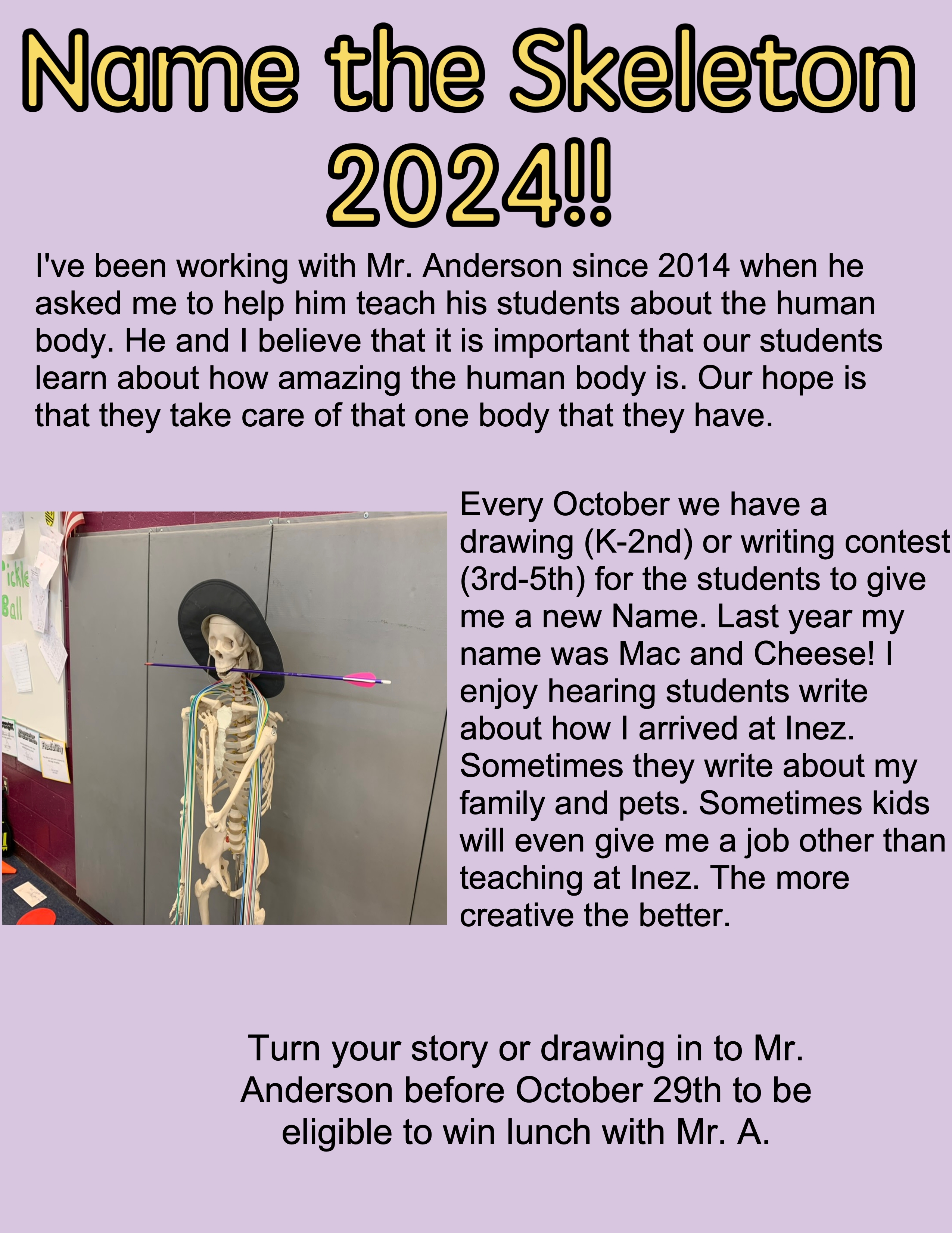 Uncategorized Name the Skeleton Contest!! October 17, 2024 Share this: Click to share on X (Opens in new window) X Click to share on Facebook (Opens in new window) Facebook Like Loading... Related Post navigation ← Family Adventure!! Drop-in Archery!! → About inezpe View all posts by inezpe → Leave a comment Cancel replyBasic HTML allowed. Δ